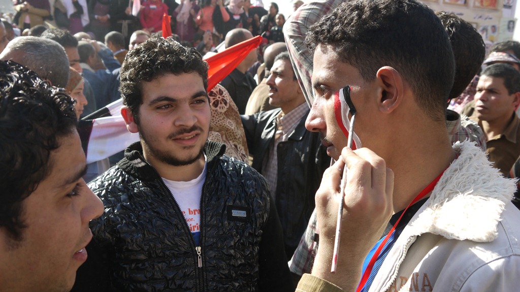 Een jongeman vraagt of ik journalist ben van een Engelse krant. Wanneer ik “nee” zeg, is zijn interesse in mij meteen weg, maar even later komt hij toch terug. Hij legt uit waar het vandaag over gaat, met een toon alsof hij voor alle aanwezigen spreekt: vorige week hadden de mensen nauwelijks kans om feest te vieren, omdat Mubarak pas in de loop van de vrijdagmiddag aftrad en veel mensen op zaterdag gewoon moesten werken, maar nu heeft iedereen vrij. Bovendien is de president wel weg, maar dat is niet genoeg: de boodschap van vandaag is dat alle zittende ministers op moeten stappen en dat er eerlijke verkiezingen komen. Ik vraag hem of loonsverhoging voor de armen ook een thema is, maar dat is volgens hem nu niet aan de orde. Natuurlijk, er wordt in Egypte gestaakt voor betere salarissen, maar hier op Midan Tahrir gaat het alleen over politiek, vrijheid en democratie. Tot slot wil hij weten of ik als buitenlander de afgelopen tijd ben lastiggevallen. Als iemand mij iets aandoet, moet ik het hem en zijn vrienden zeggen. Dan verdwijnt hij weer in de menigte.