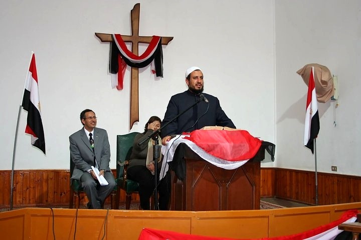 De helft van de aanwezigen is moslim. “Normaal komen moslims alleen naar de kerk voor een dag van farah [“vreugde,” de Arabische aanduiding voor een bruiloft] van christelijke vrienden of bekenden,” zegt de predikant, “maar vandaag vieren we de farah van Egypte en daarom zijn we ook vandaag hier met zijn allen bijeen.” Hij benadrukt dat de dienst geen politieke bijeenkomst is: de kerk verdedigt niet één bepaald politieke standpunt en christenen kunnen in principe op alle partijen stemmen. Wanneer sjeik Mustafa van de Grote Moskee later tijdens de dienst in het vuur van zijn betoog toch een politieke uitspraak doet, tikt de dominee hem vriendelijk op de vingers.