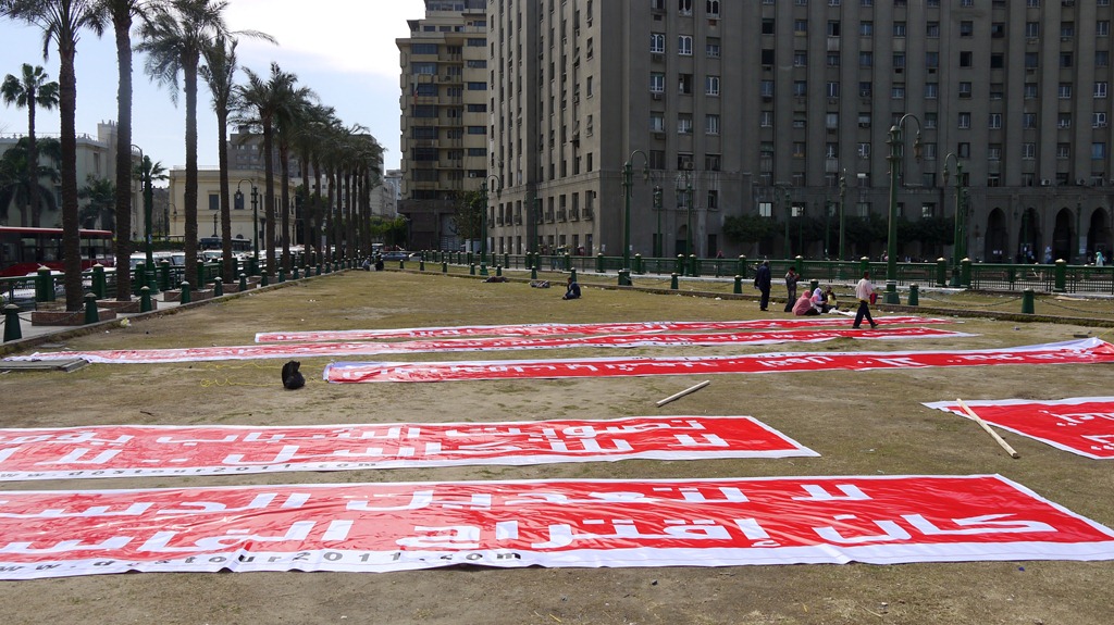 Cairo, vrijdag 11 maart 2011 rond het middaguur. Kwart voor twaalf zet een taxichauffeur mij moeiteloos midden op Midan Tahrir af, maar even later loopt het vol en worden de wegen afgezet voor het middaggebed. Spandoeken roepen op tot een echt nieuwe grondwet. Een groot kartonnen bord plaatst het geheel in internationaal perspectief: “Revolutie in Tunis, revolutie in Egypte, revolutie in Libië, [we gaan door] tot de overwinning.”
