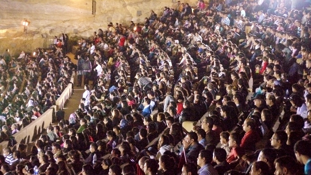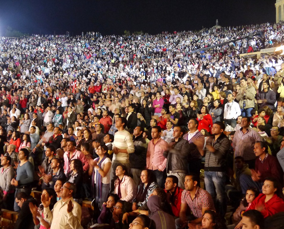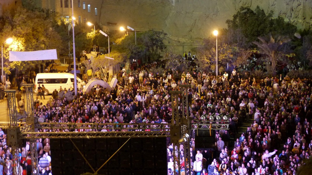 Vrijdag op zaterdag nacht zijn ruim twintigduizend Egyptische christenen bijeengekomen om voor hun land te bidden in de rotskerk in Cairo. De rotskerk heeft de vorm van een groot openluchttheater met 14.000 zitplaatsen aan de voet van de berg Moqattam.