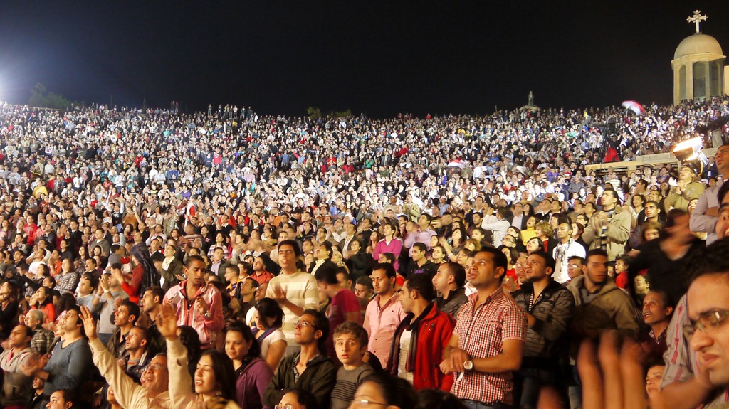 Hoewel het duidelijk is dat vanavond alles in het teken van Egypte staat, begint ds. Sameh zijn preek met een oproep om een moment terug te blikken op ons persoonlijke leven dit jaar en daar Gods hand in op te merken. Heel veel tijd voor bezinning is er niet, want al snel vraagt hij ieder te gaan staan die God wil prijzen voor dit jaar. “Ga staan, hier te midden van duizenden mensen en voor het oog van vele camera’s, om God te loven.”