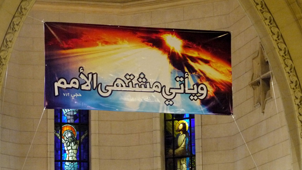 Na bijna twintig minuten lopen zijn we om het afgezette gebied heen en bereiken we de kerk. Het detectiepoortje staat aan, maar er wordt vrij achteloos mee omgegaan. Wel staan er overal ordebewakers in oranje hesjes om ons de toegang tot de hoofdzaal te beletten omdat deze vol is. Als buitenlander kom ik er echter overal gemakkelijk langs en kan ik onze student steeds in mijn kielzog meenemen, totdat we de kerkzaal daadwerkelijk binnen willen gaan door de deur bij het buitenlandersvak (waar men via een hoofdtelefoon naar een Engelse vertaling kan luisteren): ik krijg meteen een plaats toegewezen, maar voor de student is men onverbiddelijk. Hij is honderd procent Egyptisch en moet buiten op de binnenplaats de dienst via het scherm volgen—dezelfde binnenplaats waar pas nog een noodhospitaal was om gewonde demonstranten van het Tahrirplein te verplegen.