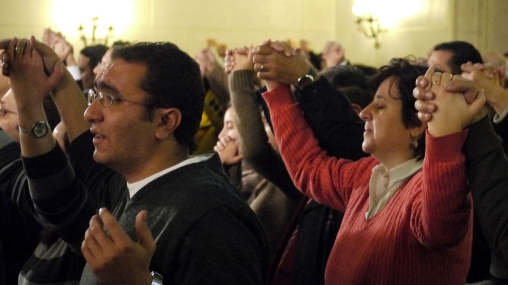 “2011 is ook het jaar van eenheid tussen christenen: vooral vanaf 11/11 is de eenheid gegroeid.” Op 11 november was er een landelijke gebedsnacht voor christenen van alle denominaties met als hoogtepunt de openluchtdienst in de immense rotskerk. Ds. Sameh rept met geen woord over het pijnpunt dat hij als protestant niet in die orthodoxe kerk mocht spreken, maar zegt alleen: “De grootste eenheid zien we hier vannacht: bij ons zijn orthodoxe en katholieke priesters en zij zullen met ons bidden. Straks zullen we hand in hand de kerk uitlopen en tot God zingen. In mijn hart zie ik al de geboorte van één kerk. Hier in de kerk zitten we ook al met verschillende achtergronden. Willen alle orthodoxen eens hun hand opsteken?” Zo’n kwart van de handen gaat omhoog. Ik vraag me af of dit toch niet wat pijnlijk is voor de orthodoxe priester: hij is genodigd als gast en dus is zijn aanwezigheid begrijpelijk, maar het gewone volk zou nu de ouderjaarsavondvieringen in de orthodoxe kerken bij behoren te wonen. Alle waarschuwingen ten spijt dat protestanten ten diepste ketters zijn en niet naar de hemel gaan, dat je door een protestants huwelijk niet echt in de echt wordt verbonden en dus feitelijk gaat hokken, enzovoort, oefenen de evangelicale kerken een aantrekkingskracht uit op de orthodoxe jeugd die omgekeerd veel minder sterk is.