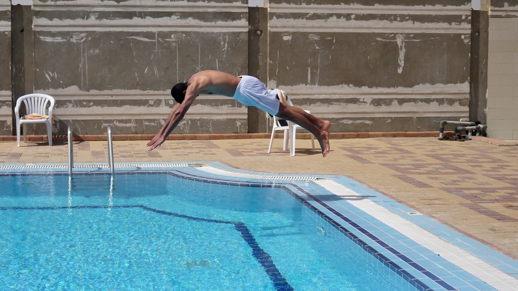 De grote trekker van het oord is het zwembad, maar volgens de meeste studenten is het water te koud voor een frisse duik. Een enkeling laat echter de kans op een actiefoto niet ontlopen.