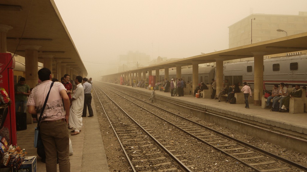 Een week geleden was ik rond het middaguur op station Asyut (zo’n vierhonderd kilometer ten zuiden van Cairo) en nam ik onderstaande foto. De zon was onzichtbaar vanwege de zwaarste zandstorm van het jaar. Een etmaal ervoor was de lucht nog strakblauw en de zon brandend scherp en was het beter om in de schaduw te blijven. Bij een zandstorm is de zon geen probleem, maar is het vanwege de stofdeeltjes in de lucht wel zaak zo veel mogelijk binnen te blijven.