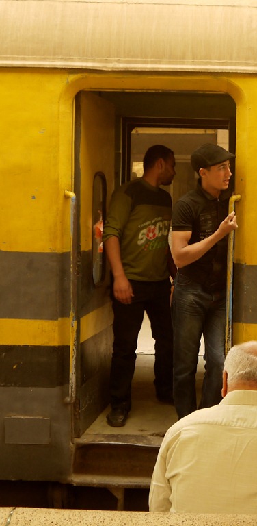 Een klein detail op bovenstaande foto: links ziet u het perron tussen spoor 1 en spoor 2, daarnaast ziet u spoor 2 en spoor 3 zelf en een man die deze sporen net is overgestoken, en daarnaast het perron tussen spoor 3 en 4 en de trein op spoor 4. Hoewel er achter mijn rug wel ergens een loopbrug was om van perron naar perron te gaan, is het in Egypte vrij gebruikelijk om gewoon even over de rails te lopen. Vanaf de hoofdingang naar het perron tussen spoor 1 en 2 hoefde ik me overigens niet aan dergelijke waaghalzerij te wagen: omdat spoor 1 een enkel spoor is met aan beide kanten een perron, vormde een stoptrein waarvan aan beide kanten de deuren open stonden de ideale gelijkvloerse verbinding tussen het zijperron bij de hoofdingang en het perron tussen spoor 1 en 2 (zie foto links).