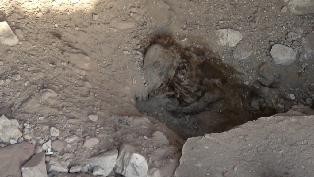 Wat betreft de levende dieren ziet men vier, vijf honden, die wel vervaarlijk blaffen maar niet fatsoenlijk op de gevoelige plaat willen, en enkele ratten die te vlug zijn om ook maar een fotopoging te wagen. Het hoogste muurdeel dat de kop van een beest symboliseert laat zich in de namiddagzon wel afbeelden.