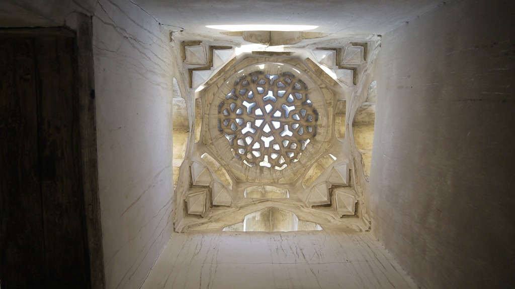 Het probleem van veel klassieke zuilen is dat het versierde kapiteel zich zo ver boven de vloer bevindt dat men een stijve nek krijgt van het omhoog kijken. In dit paleis is dat probleem opgelost door de zuil op de grond te leggen.