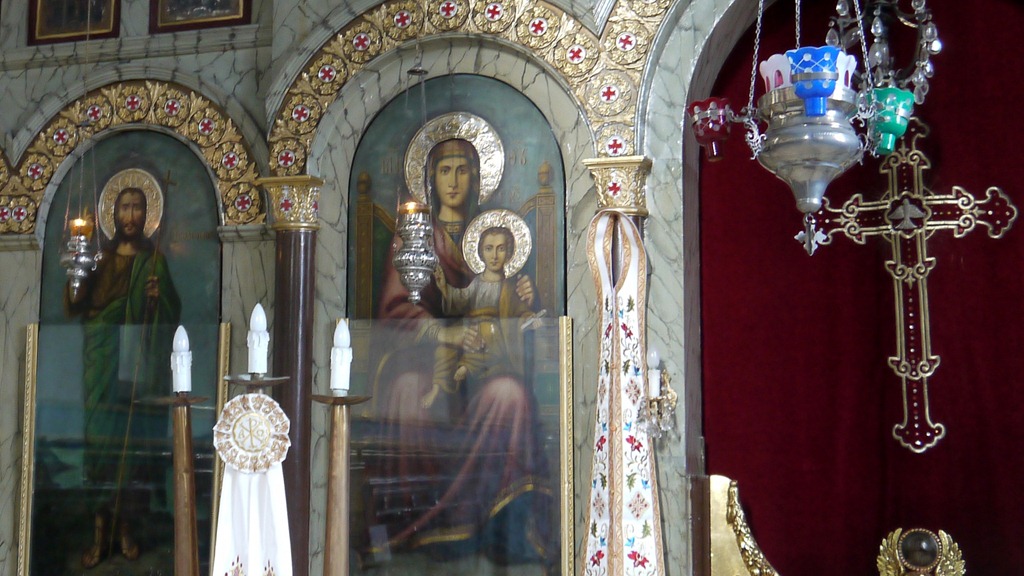De orthodoxe kerk hangt vol iconen die door mensen worden gekust en er zijn relikwiënkistjes waar mensen de hand opleggen of de mond op drukken.