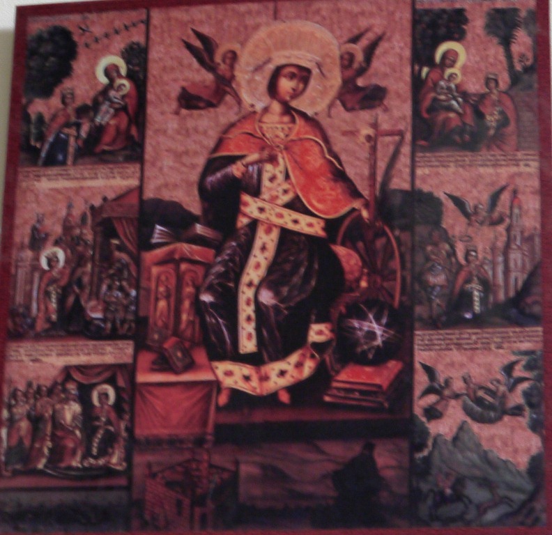 Inmiddels heeft mijn begeleider er een monnik bijgehaald die mij in eenvoudig Engels het verhaal van Sint Catharina vertelt: “In de tijd dat de Romeinse keizers nog heersten was Catharina een jongevrouw die zich alle wetenschappelijke kennis van haar dagen eigen had gemaakt en een man verlangde te trouwen van gelijk ontwikkelingsniveau. Velen die naar haar hand dongen moest ze derhalve teleurgesteld afslaan. Op een dag bezocht de Maagd Maria met haar Kind haar en Maria was enthousiast over Catharina, maar het Kind wendde het hoofd af. Maria vroeg wat er aan scheelde. ‘Zij is niet gedoopt,’ antwoordde het Kind. Daarop liet Catharina zich dopen en vervolgens verscheeen Maria opnieuw met het Kind, dat nu niet het hoofd afwendde, en zo werd Catharina de bruid van Christus. Toen de keizer de christenen vervolgde, werden tweehonderd wijze mannen naar Catharina gestuurd om haar ervan te overtuigen het christelijk geloof af te zweren, maar in plaats daarvan overtuigde zij hen christen te worden. Nadat zij ter dood was gebracht [in 305] werd haar lichaam door engelen overgebracht naar de hoogste top van de Sinaï [de Mozesberg of Horeb aan de voet waarvan het Sint-Catharina-klooster staat].”