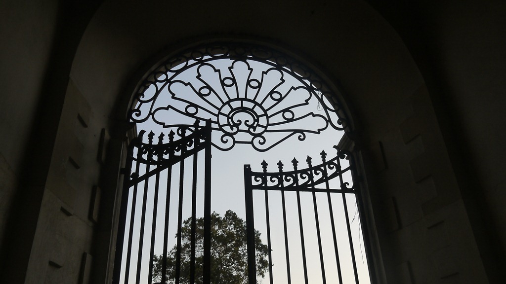De toegangspoort van de kerk brengt de bezoeker eerst in een tuin, van waaruit zelfs de omringende hoogbouw een vriendelijke aanblik krijgt.
