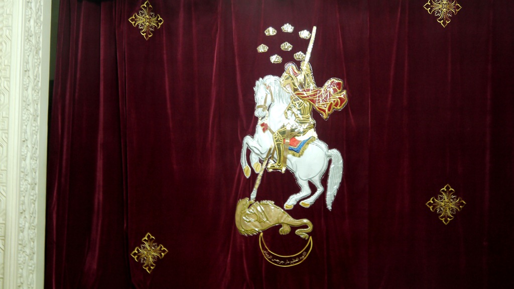 Midden voor hangt een gordijn met een afbeelding van Sint Joris en de draak.