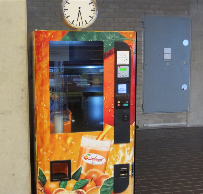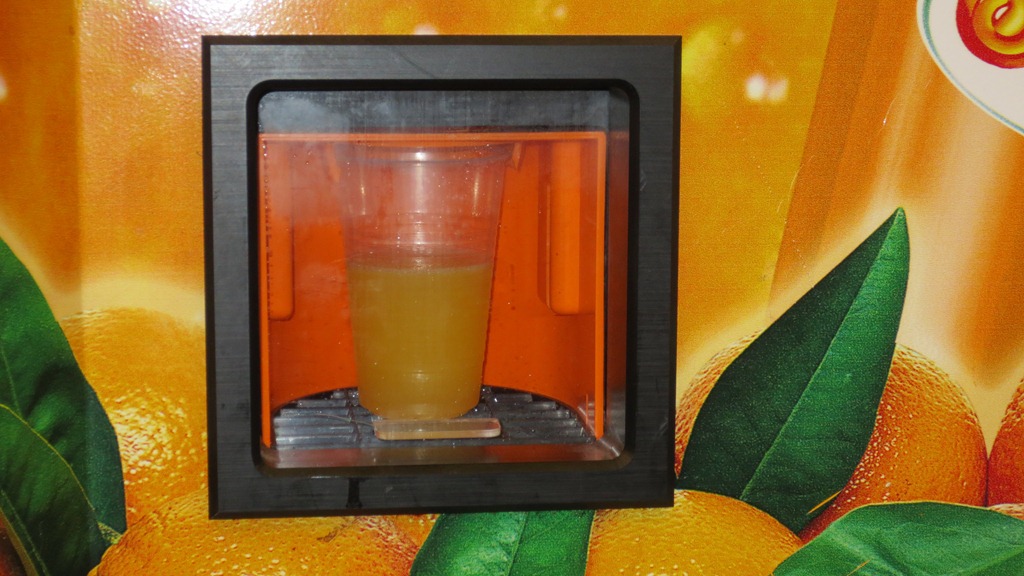 Vandaag heb ik echter een alternatief ontdekt: in de Vrije Universiteit staat een heuse ingeblikte Marwa: een sinaasappalsapautomaat die echte vruchten voor je ogen perst totdat het plastic glas half vol is. Het enige wat men moet doen is een bankpas insteken en op een knop drukken en dan gaat verder alles vanzelf. In Egypte krijgt men voor minder dan een kwart van de prijs de sap gereserveerd in een echt glas met een gratis rietje, maar dat mag de pret niet drukken.
