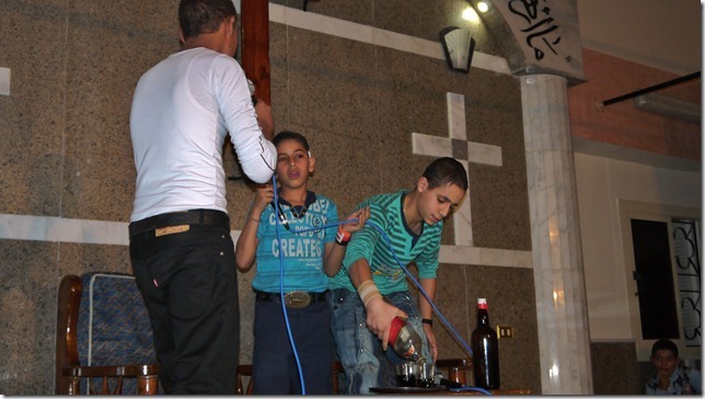 Vanavond blijft dit alles heel impliciet. Ds. Sameh zegt wel dat er naast de hand van God ook een andere hand in Egypte werkzaam is. “We moeten niet strijden tegen mensen maar tegen de ‘overste dezer wereld,’ die velen bewust of onbewust dienen en die uit is op armoede en onderdrukking en vernedering van vrouwen en kinderen.” Maar dan vervolgt hij zijn overdenking van Haggaï 2: “2011 was het jaar van de aardbeving (vers 7). In de harten van de volken is een wens geboren. De mensen roepen: ‘Help, o God!’ Vanaf vanavond zal de Wens der heidenen komen (vers 8) en Gods heerlijkheid zal zichtbaar worden in 2012.” We zingen: “Kom, Jezus; kom, Jezus, kom.”