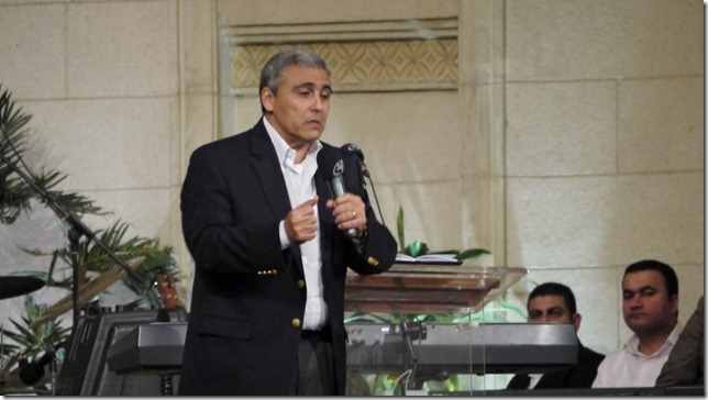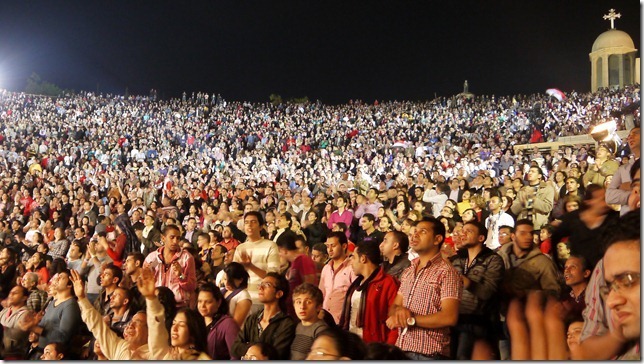 “2011 is ook het jaar van eenheid tussen christenen: vooral vanaf 11/11 is de eenheid gegroeid.” Op 11 november was er een landelijke gebedsnacht voor christenen van alle denominaties met als hoogtepunt de openluchtdienst in de immense rotskerk. Ds. Sameh rept met geen woord over het pijnpunt dat hij als protestant niet in die orthodoxe kerk mocht spreken, maar zegt alleen: “De grootste eenheid zien we hier vannacht: bij ons zijn orthodoxe en katholieke priesters en zij zullen met ons bidden. Straks zullen we hand in hand de kerk uitlopen en tot God zingen. In mijn hart zie ik al de geboorte van één kerk. Hier in de kerk zitten we ook al met verschillende achtergronden. Willen alle orthodoxen eens hun hand opsteken?” Zo’n kwart van de handen gaat omhoog. Ik vraag me af of dit toch niet wat pijnlijk is voor de orthodoxe priester: hij is genodigd als gast en dus is zijn aanwezigheid begrijpelijk, maar het gewone volk zou nu de ouderjaarsavondvieringen in de orthodoxe kerken bij behoren te wonen. Alle waarschuwingen ten spijt dat protestanten ten diepste ketters zijn en niet naar de hemel gaan, dat je door een protestants huwelijk niet echt in de echt wordt verbonden en dus feitelijk gaat hokken, enzovoort, oefenen de evangelicale kerken een aantrekkingskracht uit op de orthodoxe jeugd die omgekeerd veel minder sterk is.