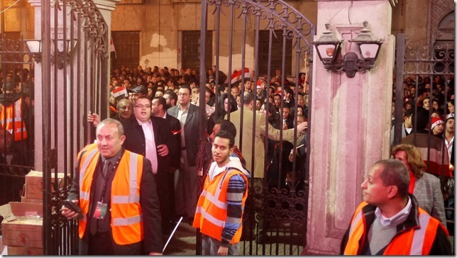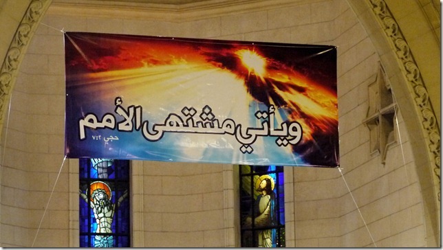 Na bijna twintig minuten lopen zijn we om het afgezette gebied heen en bereiken we de kerk. Het detectiepoortje staat aan, maar er wordt vrij achteloos mee omgegaan. Wel staan er overal ordebewakers in oranje hesjes om ons de toegang tot de hoofdzaal te beletten omdat deze vol is. Als buitenlander kom ik er echter overal gemakkelijk langs en kan ik onze student steeds in mijn kielzog meenemen, totdat we de kerkzaal daadwerkelijk binnen willen gaan door de deur bij het buitenlandersvak (waar men via een hoofdtelefoon naar een Engelse vertaling kan luisteren): ik krijg meteen een plaats toegewezen, maar voor de student is men onverbiddelijk. Hij is honderd procent Egyptisch en moet buiten op de binnenplaats de dienst via het scherm volgen—dezelfde binnenplaats waar pas nog een noodhospitaal was om gewonde demonstranten van het Tahrirplein te verplegen.
