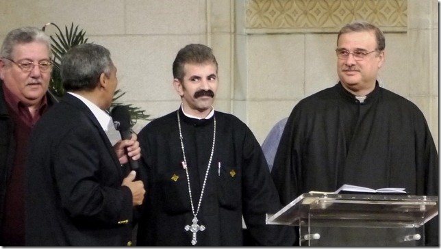 “Er zijn ook bruggen geslagen tussen moslims en christenen: hand-in-hand hebben we gestaan, samen maken we één hand. Net als de kerk diende ook een naburige moskee als noodhospitaal en dit leidde tot goede samenwerking: waar nodig hielpen we elkaar en wisselden we dokters uit.” Enkele moslimbroeders en -zusters worden uitgenodigd op het podium te komen voor een begroeting. “Eigenlijk zijn we allemaal kopten” (volgens de gangbare etymologie komt “kopt” van “Egyptenaar”): “Moslim of christen, dat is je relatie tot God, maar er is ook de relatie met elkaar: wij zijn allen Egyptenaren.”
