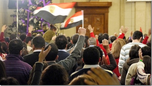 Tijdens deze oudejaarsavonddienst lijkt alles één groot feest en dat begint mij te verbazen. Zelfs wie in de revolutie Gods hand opmerkt, moet zien dat de revolutie niet enkel vrede, vreugde en voorspoed heeft gebracht. Of het terecht is of niet zal moeten blijken, maar de massale winst voor moslimbroeders en salafisten bij de parlementsverkiezingen heeft veel christenen met zorg vervuld. De revolutie had even de zoete droom gebracht dat de corruptie zou worden uitgebannen en dat het geld dat al die jaren aan de top was blijven hangen nu onder het gewone volk zou worden verdeeld, zodat men slapend rijk zou worden. Tot nu toe is er echter alleen maar een diepe economische crisis gekomen. En een taxichauffeur zei onlangs: “Vroeger stalen de leiders van de mensen. Nu stelen de mensen van elkaar.”