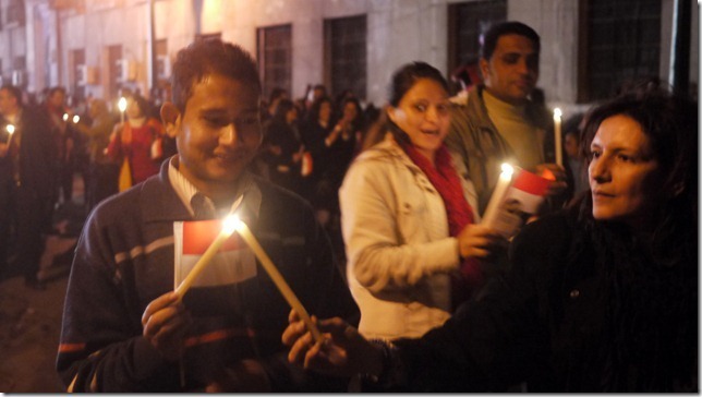Ds. Sameh benadrukt nog even de spelregels die ook al op de website van de kerk stonden: alleen een vlag en een kaars en eventueel een foto van een martelaar van de revolutie mag je meenemen, geen kruizen, geen spandoeken, geen politieke leuzen—vanavond is het een feest, niet een demonstratie.