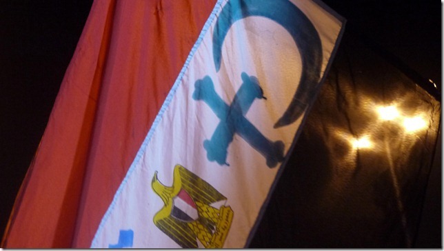 Goed half twaalf stopt de traditionele volksmuziek en is het podium voor het koor van de kerk. Weer zingen we bèrik bilèdi en weer wapperen de vlaggen. Het lied appelleert aan de gedeelde godsdienstigheid der Egyptenaren en doet het verschil tussen moslim en christen even naar de achtergrond verdwijnen. Samen herinnert men de revolutie en roept men aan de vooravond van het nieuwe jaar God aan.
