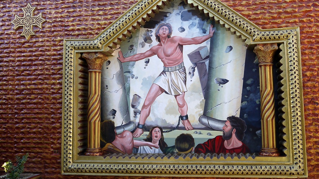 Simson duwt de Filistijnse tempelzuilen omver.