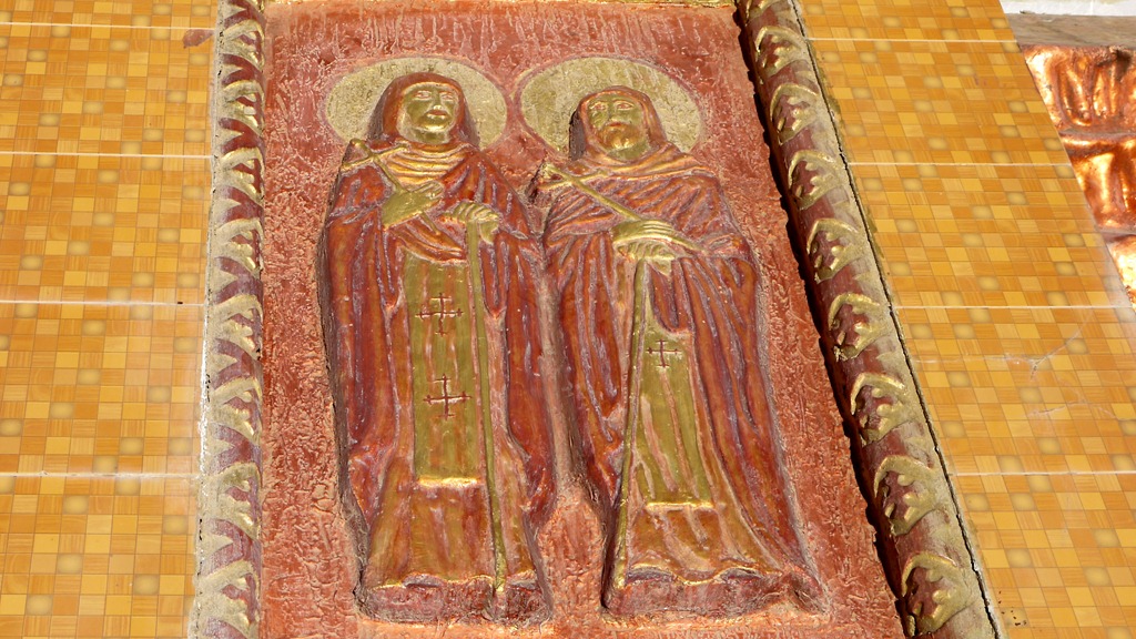 Onder de engelen en spreuken bevinden zich afbeeldingen van heiligen. Hieronder staan (naar ik meen) Sint Paulus en Sint Antonius, de twee beroemde vroegchristelijke kluizenaars naar wie kloosters bij de Rode Zee zijn vernoemd.