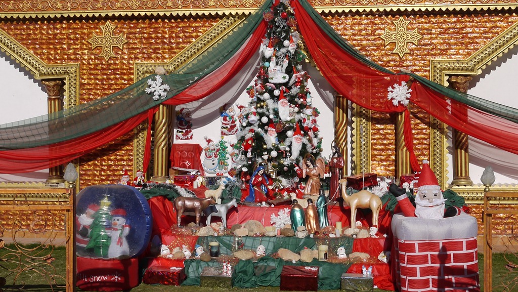 Voor één van de witte vlakken staat een kerststal. Terwijl kerk en tuin als geheel zich een beetje tussen kunst en kitsch bewegen met het overdadig gebruik van goudkleurige verf en de simpele heldere afbeeldingen—de eenvoudige kopt spreekt dit waarschijnlijk aan; de chauffeur die mij naar het Witte Klooster brengt, moedigt me in elk geval erg aan deze kerk (de Sint Karaas-kerk) te bezoeken—, is de kerststal pure kitsch: de opblaaskerstman rechts beweegt op en neer en trekt daarmee de aandacht naar zich toe.