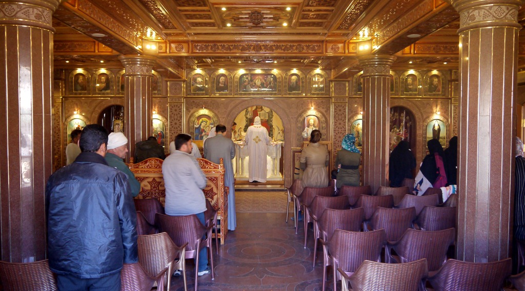 Wanneer ik door de kerktuin loop, vang ik uit een luidspreker Arabische woorden uit 1 Johannes op en besluit ik de kerk van binnen te gaan bekijken. Een grote glazen lift biedt uitzicht over de omgeving en het Witte klooster en brengt me naar de derde verdieping, waar zich de eigenlijke kerkruimte bevindt en een mis gaande is.