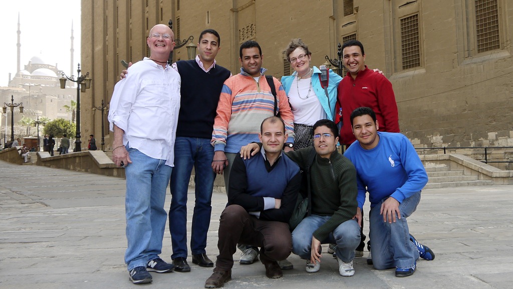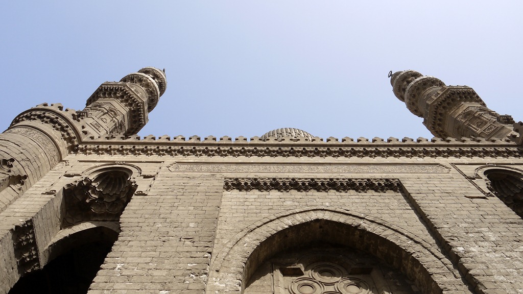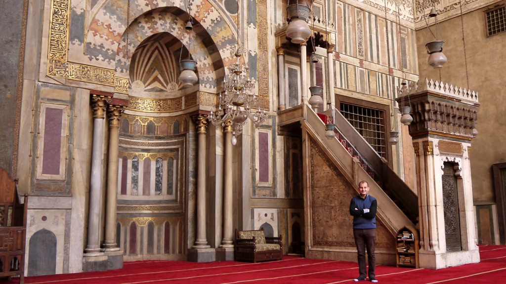 Eén van de grootste islamitische bouwwerken ter wereld is de moskee-madrasa van sultan Hassan uit 1356–1362 na Christus. Het woord madrasa betekent school en in deze moskee werden maar liefst vier scholen gebouwd, inclusief kamers voor studenten. Als de studenten van ons seminarie eerder hadden geleefd en moslim waren geweest, hadden ze wellicht hier gestudeerd en gewoond. Nu zijn er in de moskee nog wel godsdienstlessen, maar geen volledige opleidingen met inwonende leerjongeren meer. Aan het eind van het bezoek aan de moskee afgelopen zaterdag (na het bezoek aan het paleis van emir Taz en de moskee van Ibn Toeloen) lieten vijf van onze studenten ook even zien dat ze christen zijn door op de trap van de direct naastgelegen moskee van al-Rifaï te gaan zitten in de vorm van een kruis.