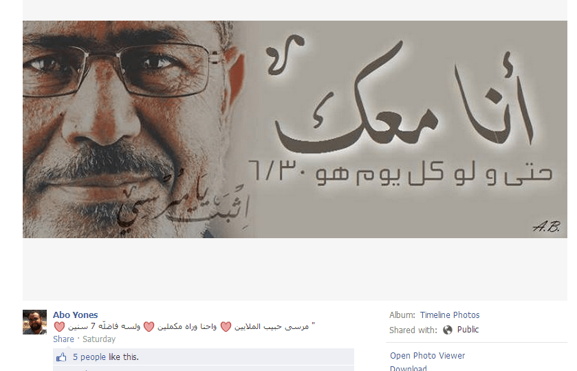 Deze link leidt tot een foto op Facebook, waarop in het Arabisch staat: “Ik sta achter je, zelfs al was het elke dag 30 juni.” Eronder staat tussen hartjes: “Morsi, geliefde van miljoenen, wij staan volledig achter je, jij hebt nog zeven jaar voor de boeg.” Hoe massaal de demonstraties gisteren ook waren, dit plaatje illustreert simpel en helder dat niet ieder zich tegen de president heeft gekeerd.