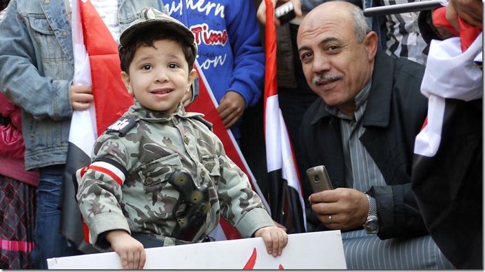 Een jongetje draagt trots een legeruniformpje. Misschien had hij hetzelfde uniformpje in februari aan op het Tahrirplein, toen Egypte feest vierde omdat Mubarak was afgetreden. Ik vraag me af hoe hij later als hij groot is op de foto’s terug zal kijken: trots dat hij in februari en in december aan de goede kant stond, of alleen trots dat hij op Tahrir was maar verdrietig dat hij vandaag gebruikt is om een militair regime te promoten of juist verbaasd hoe men feest heeft kunnen vieren om het vertrek van Mubarak? De toekomst zal het leren.