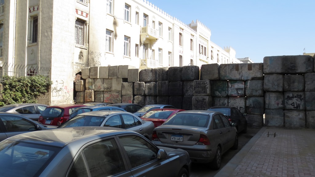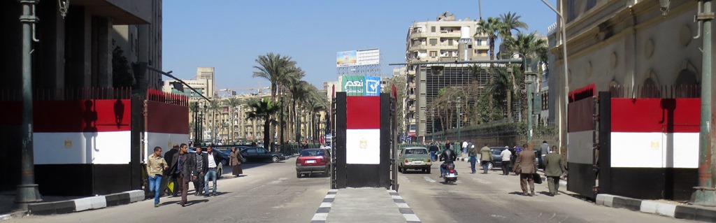 Maar Caïro heeft nu ook een gloednieuwe stadspoort, gebouwd in 2014! De dubbele poort vormt de toegangsdeuren tot het Tahrirplein vanuit zuidelijke richting. De afgelopen jaar stond hier om de situatie beheersbaar te houden een muur van betonblokken, maar daarmee was wel een hoofdverkeersader geblokkeerd. De stalen poort staat het toe het verkeer op gewone dagen door te laten en bij demonstraties stop te zetten. Gisterenavond na kerktijd was één van de twee poortopeningen al gesloten: mogelijk gaat de poort ’s nachts ook dicht. Een zijstraat heeft overigens nog wel steeds een betonblokkenmuur.