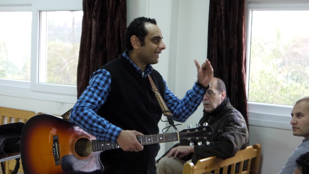Het oord is uiterst geschikt voor Egyptes zonnige klimaat: er is een zwembad, een sportveld, een tuin, en een gevlochten afdak om de felste zon te onvluchten. Op de regen van vandaag is het minder gebouwd. Het afdak houdt de regen maar half tegen en laat de andere helft door. Het sportveld wordt modderig. Het loopje van het hoofdgebouw naar de kapel van het conferentieoord maakt een mens nat. Johny kan zo moeilijk buiten wachten terwijl wij binnen met zanger Fady zingen en bidden en de preek beluisteren van mijn collega dr. Hani over Psalm 139 en stille tijd. ![]()