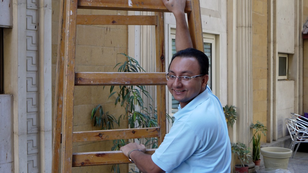 Ds. Medhat, docent Oude Testament en tegelijk ThM student Bijbelwetenschappen, duikt vandaag niet in de boeken maar klimt de ladder op.![]()