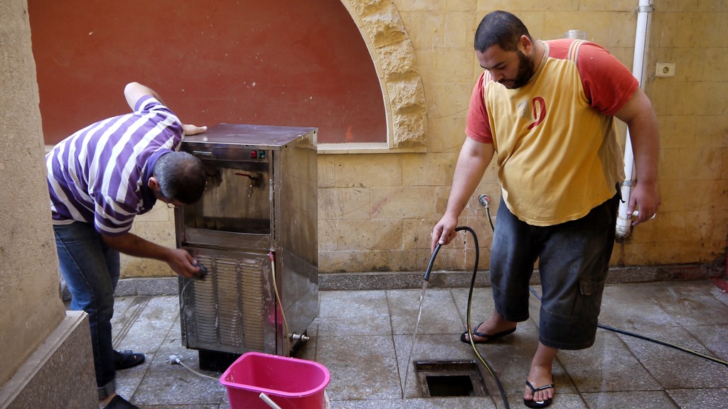 Student Seleem, koud tien dagen geleden aangekomen uit zijn geboorteland Syrië, zet zich vol overgave in om de waterkoeler stralend schoon te krijgen.