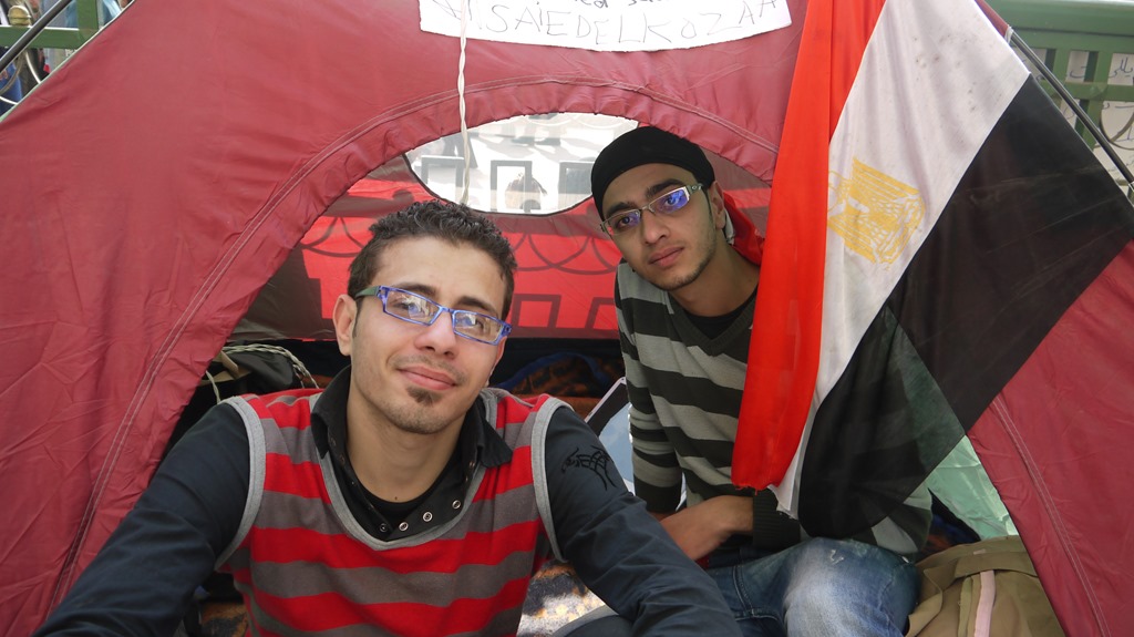 Demonstranten in tent op het Tahrirplein, de dag na de val van Mubarak in februari 2011.