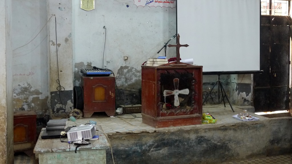 De protestantse kerk in het Egyptische dorp Beni Ebeid in het Nijldal heeft weinig uiterlijke heerlijkheid. De kerk staat in een smal straatje.![]()