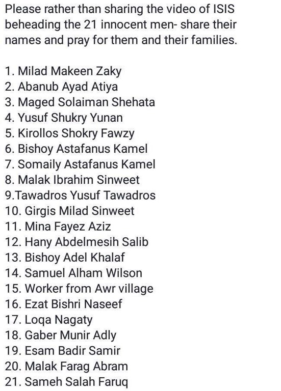 Op Facebook circuleren de namen van de 21 kopten die door IS in Libië zijn gedood: twintig mooie, veelal expliciet christelijke namen, maar van één slachtoffer staat alleen vermeld: “Werkman uit het dorp Awr.” Ik vrees dat zelfs die dorpsnaam op menig kaart van Egypte ontbreekt. Hij is de mens van Psalm 103:15,16: “De dagen des mensen zijn als het gras, gelijk een bloem des velds, alzo bloeit hij. Als de wind daarover gegaan is, zo is zij niet meer, en haar plaats kent haar niet meer.” Daarmee is over hem gezegd wat over hem te zeggen valt.
