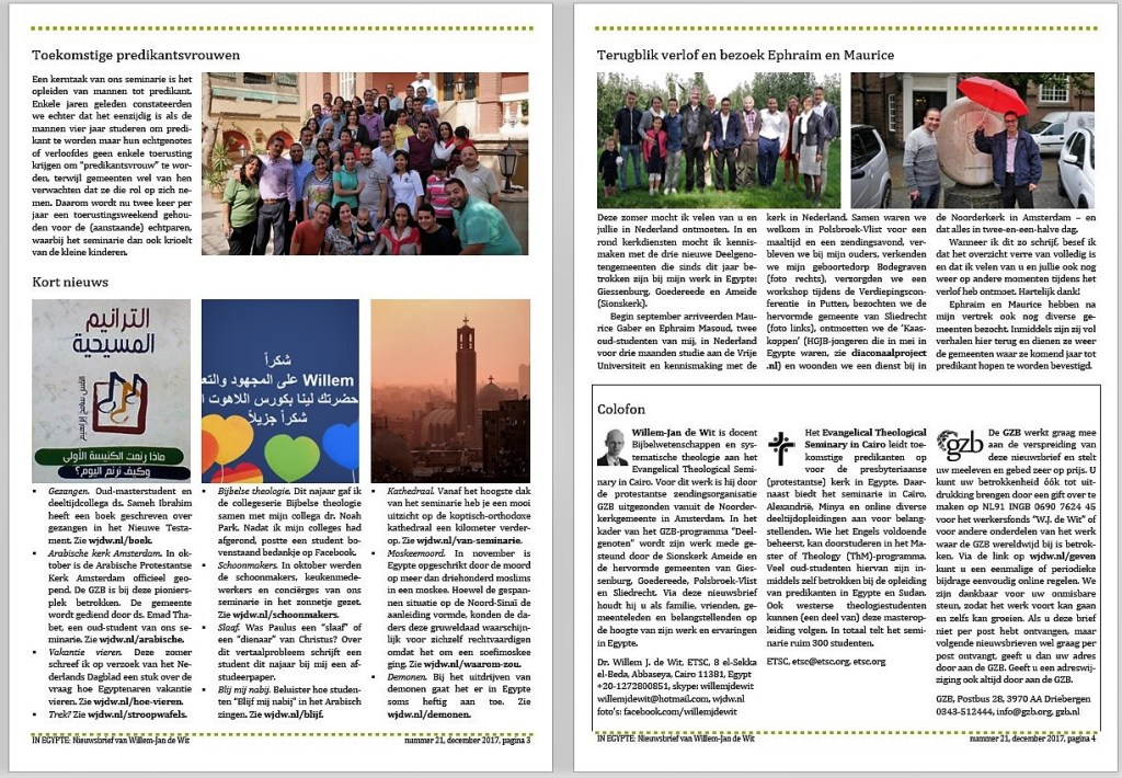 Zelf heb ik in de stad Minya (250 km ten zuiden van Caïro) een “reformatiepreek” gehouden over sola fide en goede werken, waarbij we onder andere zondag 23 en 32 van de Heidelbergse Catechismus en Jakobus 2:14–24 hebben gelezen en ik enkele gedachten uit Calvijns verklaring van Genesis 22 heb gedeeld. In verkorte vorm heb ik hetzelfde ook tijdens een kapeldienst hier op het seminarie aan de orde gesteld.