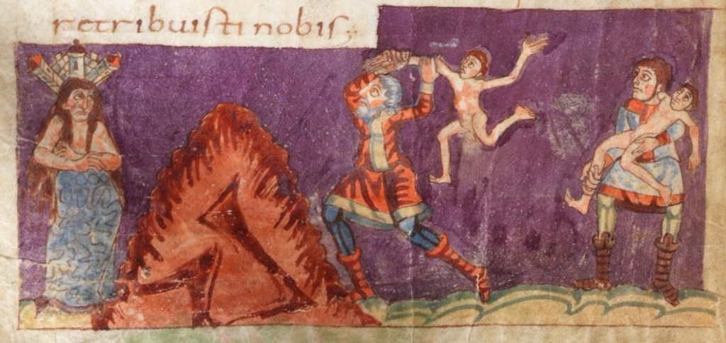 Maar mogelijk moeten we deze afbeelding van Psalm 137 symbolisch zien. Origenes en Augustinus verstonden de kindertjes/kleintjes van vers 9 als net opkomende zondetjes, die je niet moest koesteren en laten opgroeien, maar meteen in gebed dood moest slaan tegen de steenrots, dat is, tegen Christus (zie 1 Korintiërs 10:4). Gezien de populariteit van Augstinus’ uitleg van de psalmen in de middeleeuwen, is het zeker niet ondenkbaar dat de illustrator deze uitleg kende. (Zie verder het artikel van prof.dr. A. van de Beek over Psalm 137:9 in de Vroege Kerk en mijn artikel over de uitleggeschiedenis van Psalm 137, met een voorstel hoe vers 9 te zingen.) De kunstenaar wil dan niet onze moordlust, weerzinwekkende kindermoordlust, opwekken, maar ons stimuleren tot zelfonderzoek en diepgaander gebed.